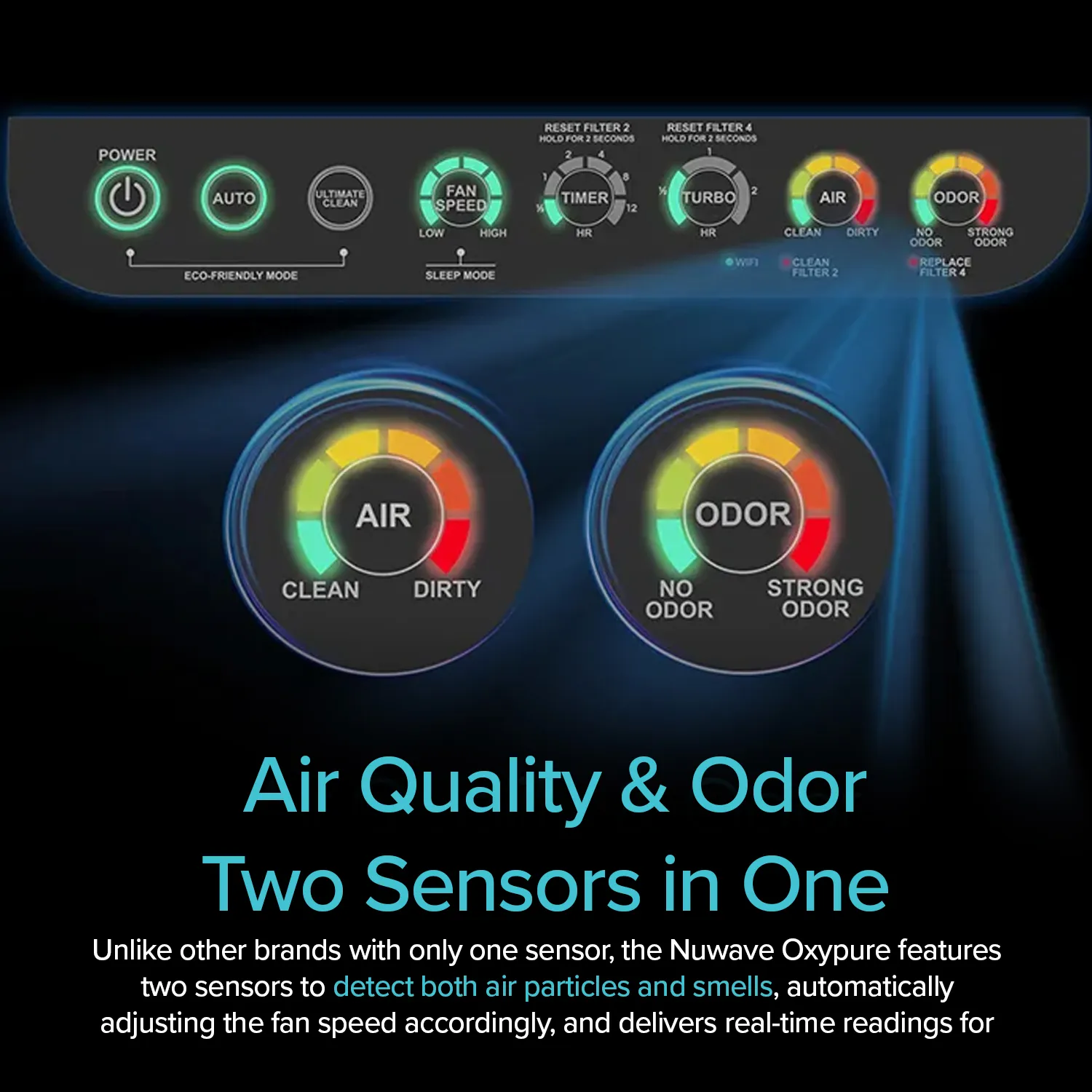Advanced Air Quality SensorsThe OxyPure air purifier automatically detects the air quality in your room along with any odours present and reacts in real time to take action quickly and easily.