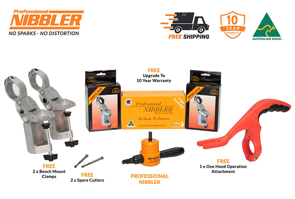 Everyone knows cutting sheet metals is either tiring, time consuming or expensive! Hardware stores typically stock one of two options: tin-snips, or expensive specialised tools with a single function. That’s why we got behind the Australian Designed and Manufactured Professional Nibbler. Not only is this nibbler tool cost-effective, but it attaches to ANY drill and makes even the most complicated metal cutting job quick and easy! Cut anything from mild steel and rusty car panels to your inconvenient corrugate overhang on your gutters. Why do it the hard way with tin snips or angle grinders, when you can do it safely and easily without sparks and distortion. Stop calling in expensive tradesmen and turn those DIY jobs from ‘too hard’ into ‘can do’.