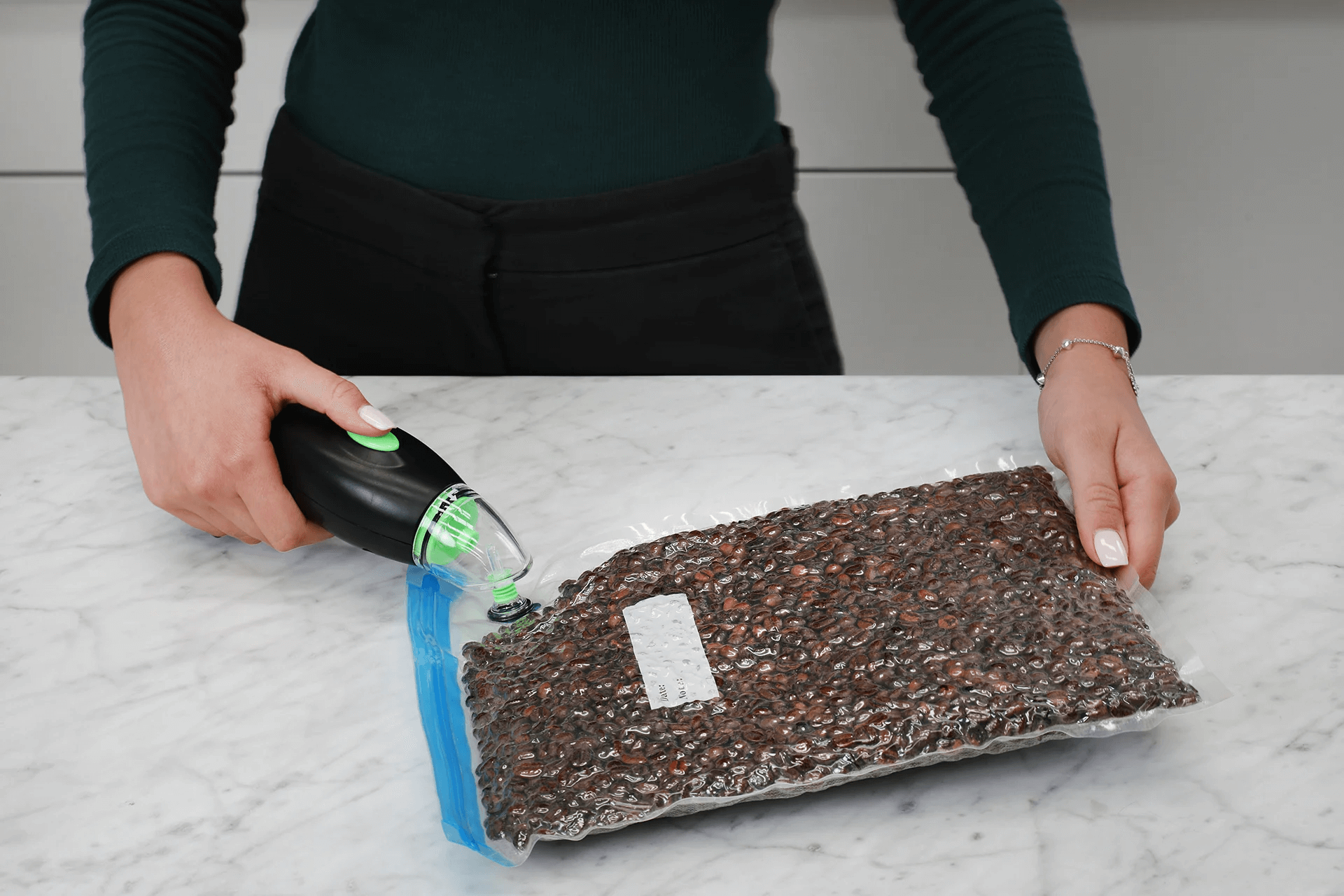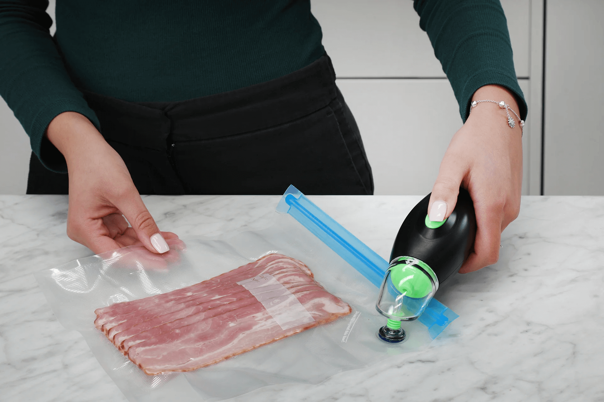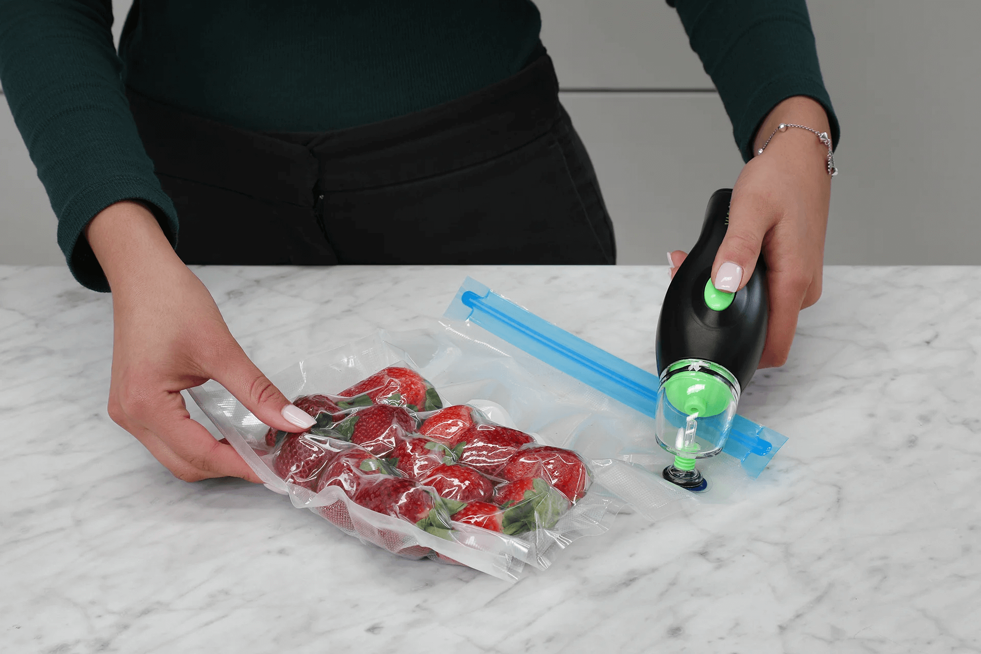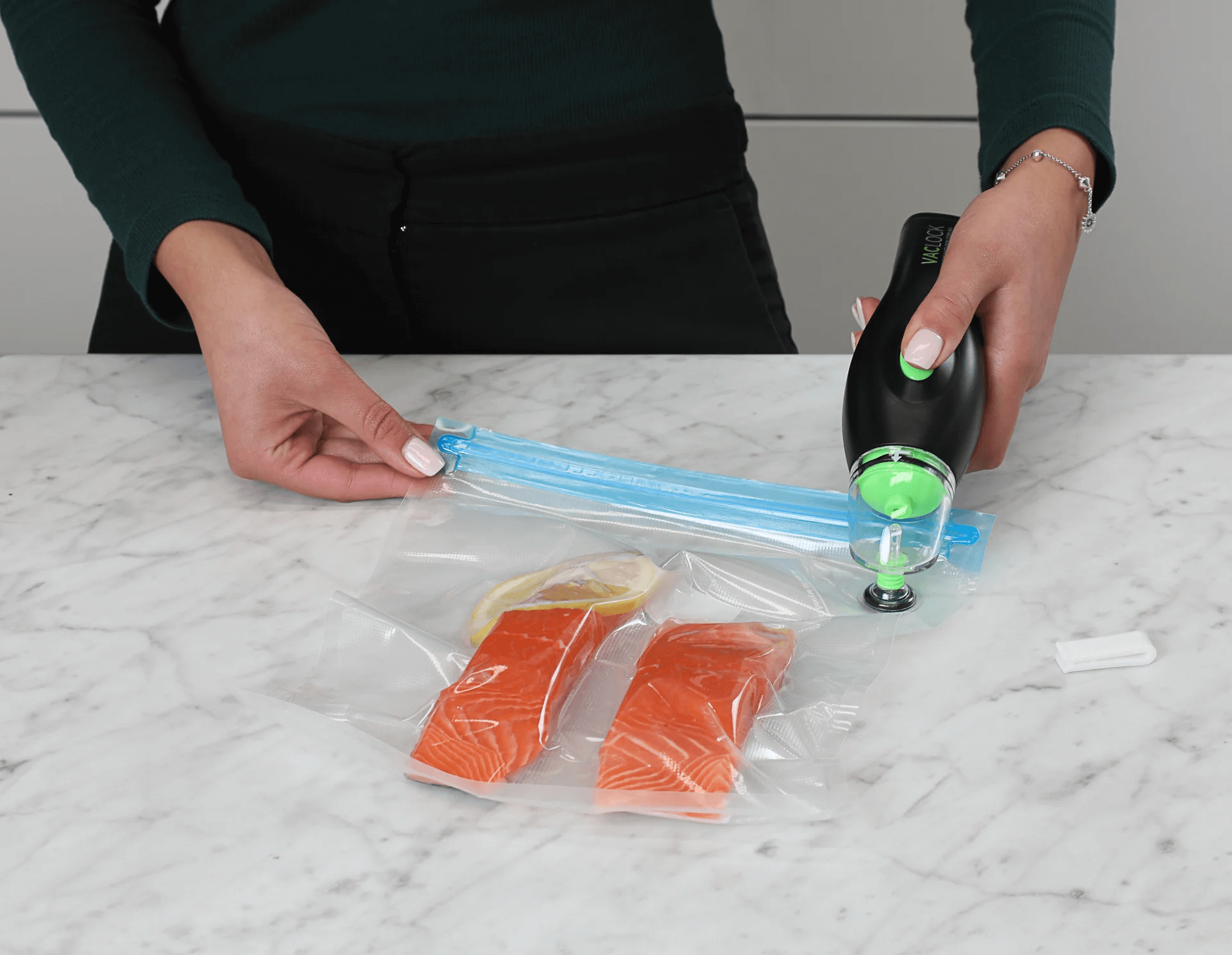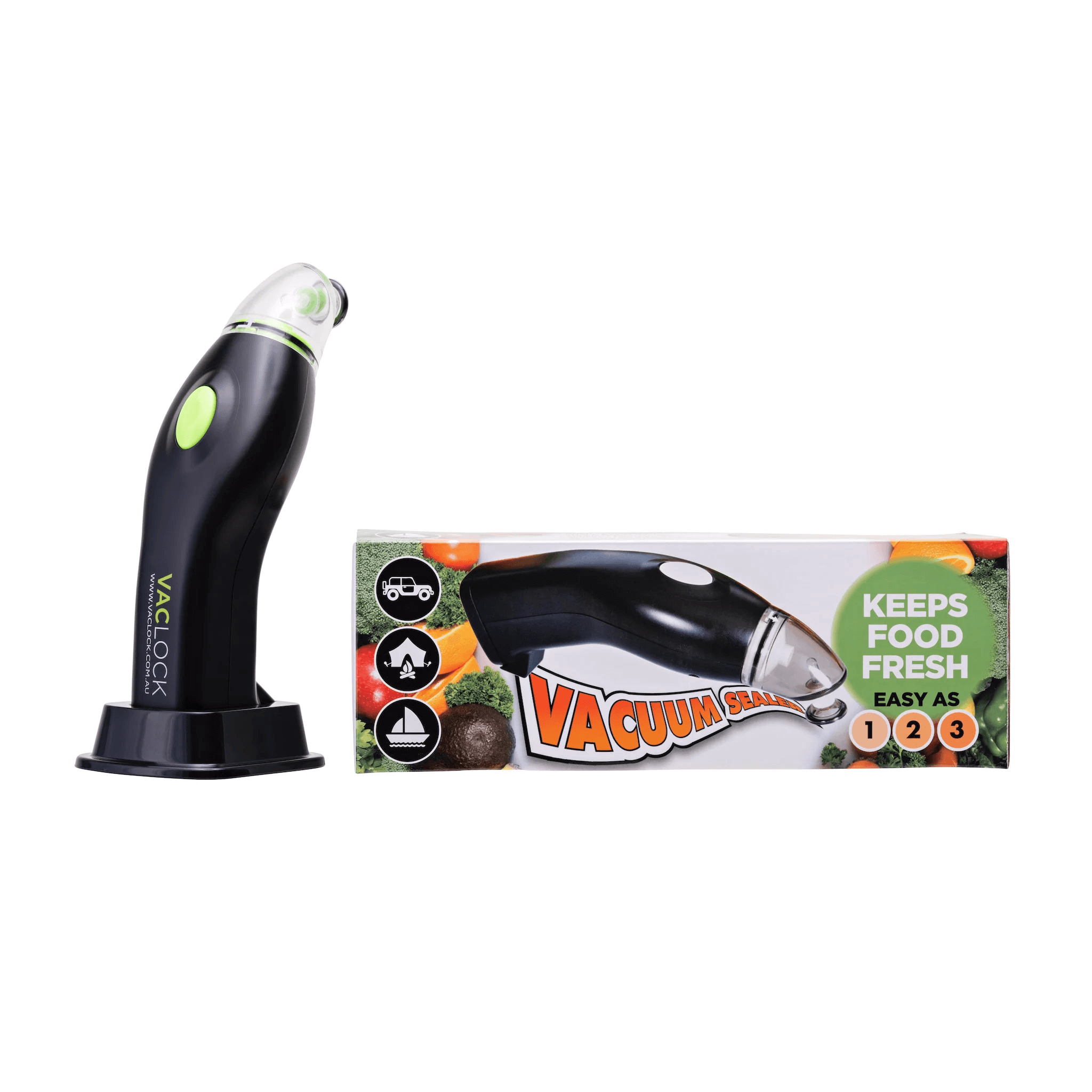 Your new VACLOCK® Portable Handheld Vacuum Sealer is designed to work with our Vacuum Containers, Reusable Vacuum Bags and Wine Bottle Caps.